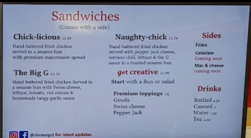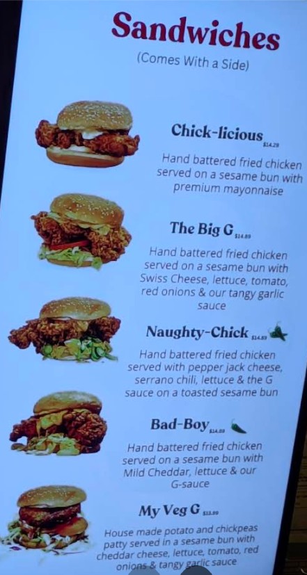 An employee recommended the Original G chicken sandwich. The. Chicken was pretty big, juicy, and I felt the batter was just the right amount along with the house garlic sauce. I ordered the coleslaw as a side. The coleslaw was really good with just the right the texture and taste. It might be some of the best slaw I’ve had in a longtime. The service was friendly and helpful. The condition of the restaurant was dated. The parking lot and inside could have used a good sweeping. There were a few nats around the table but it wasn’t overly bothersome or off putting. Come for the chicken! The price was around $15 for the sandwich and the coke was under $3. I would come back and try a different sandwich in the future.